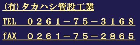 (有)タカハシ管設工業の高橋です。 ボイラー、給湯器の交換をしています。一般家庭の設備工事を50年。 安心のお見積提出、自社施工。 □Tel 本社0261-75-3168 □工事対応地域はご相談ください |