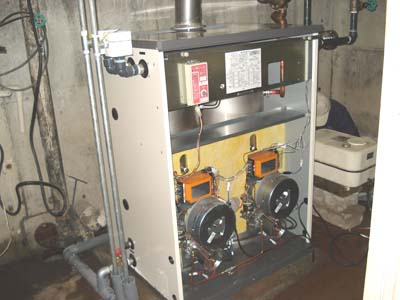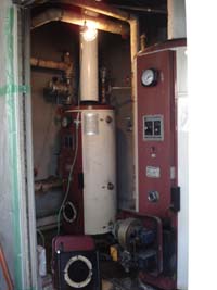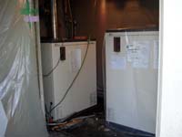 | 2缶式ボイラー=給湯と暖房を一つのボイラーで使用するタイプのボイラーが壊れたので取替えました。 お施主様との打ち合わせで今度は給湯、暖房別々のボイラーにしました。 業務用のボイラーノーリツMBX4500を2台設置。 一台は既存貯湯タンクと連結。ここでは既存の配管の撤去、配管工事に日数がかかりました。 本体2台と配管工事、既存ボイラー撤去処分、産廃処理等で、80万位しました。 |