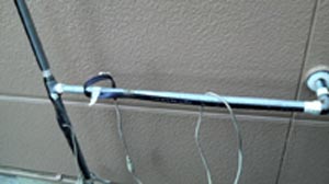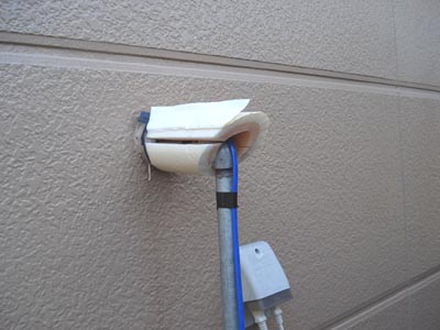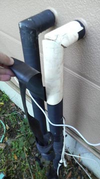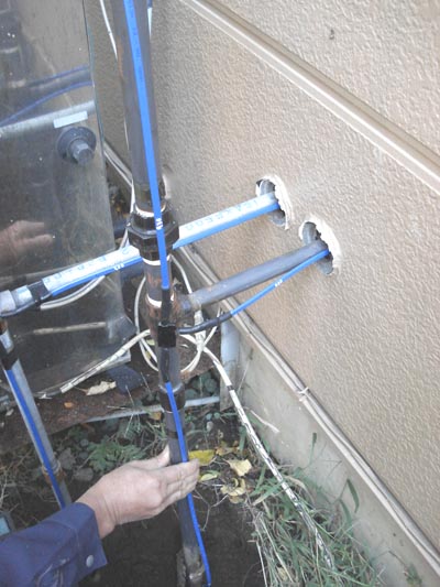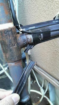 ここでは自己制御ヒーターを取り付けました。(写真の青いヒーター)配管に沿って自己制御ヒーターをテープで取り付けていきます。
