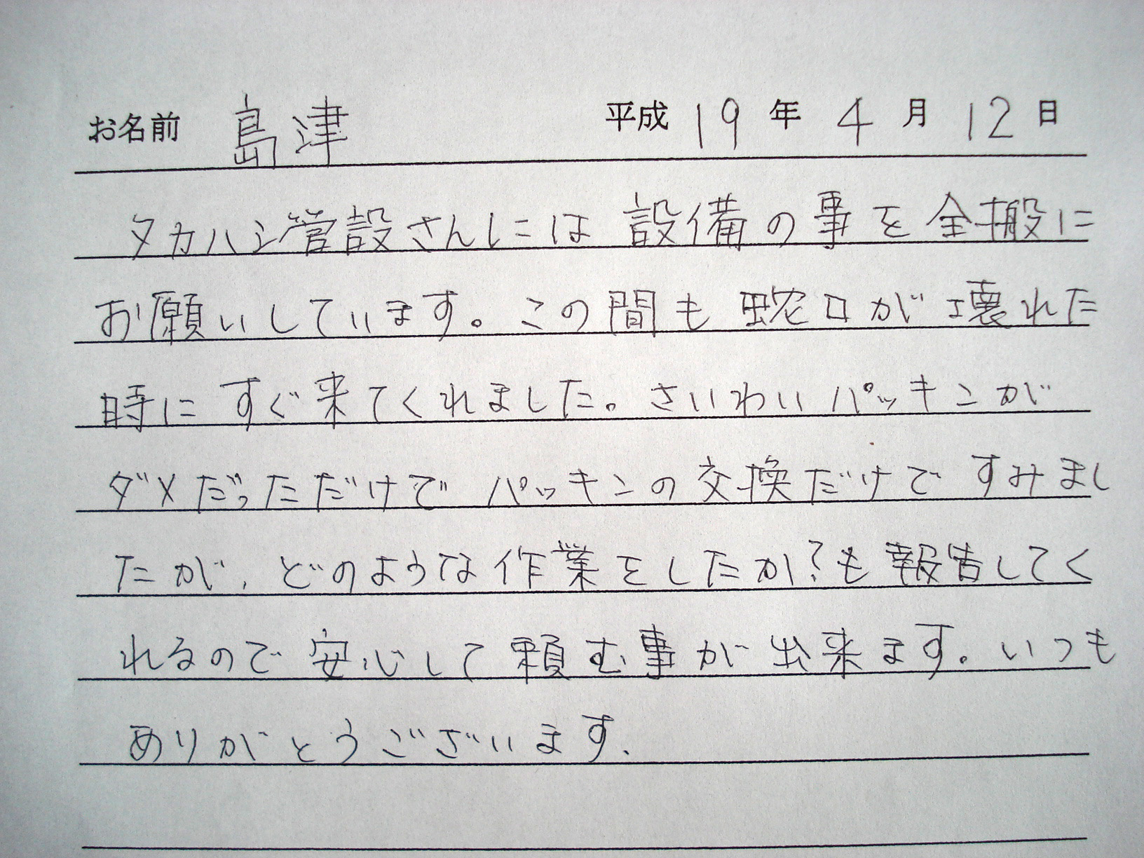 | 工事をご依頼頂いたお客様の声。ボイラー、給湯器工事を始め問合せ頂いた内容を載せております。 | |||||||||||||||||||||||||||||||||||