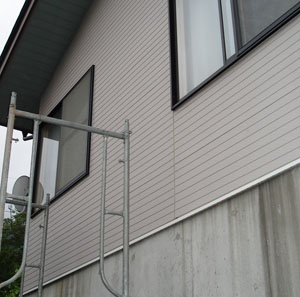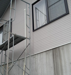 1Fが車庫になっているお宅で、室外機の取り付けに足場を使用しました。寒冷地区なので室外機は雪害を避け、高い箇所へ設置しました。三菱エアコン10畳用で、本体設置、足場、配管化粧カバーなど含めて、本体含め総工事費17万位でした。(三菱エアコン霧が峰ムーブアイ10畳用参考単価24.5万です)